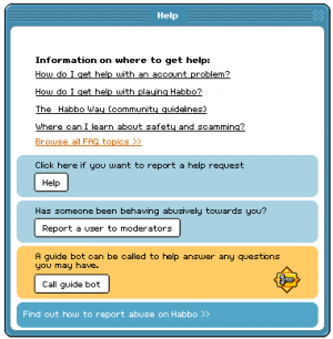 The Call For Help tool is for people that need help with habbo. Moderators that are on duty will reply back with advice on what to do. The call for help tool is located next to the room info text. If you click 'Help' the call for help tool dialouge will pop up and it will have information on how to get help and what type of help you will need. You are able to get live help or you can research on the FAQ (Frequently Answered Questions) yourself if you think you will be wasting the moderators time. It is also possible to call a 'Guide Bot' who will give you information on habbo and basic help. It is also possible to report abusive users using this tool. To report someone, click "Find out how to report abuse on habbo".