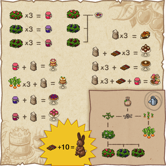 Various other ingredients were also able to be used with either the Flour or Chocolate Bar to create furni, with those not being "baking" goods harking back to previous Easter releases: