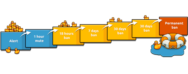 Habbo's current moderation works on a gradual system, where every offense increases a Habbo's sanction status and penalties become harsher the more times a Habbo breaks the rules. The sanctions start with an alert and continue on to mutes for 1 or 18 hours, bans for 7 or 30 days, and for Habbo's who still break the Habbo Way for a seventh time, a permanent ban.