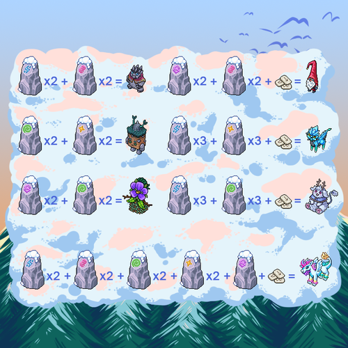 Rune Rocks and Rune Stones were the only ingredients needed to craft during the campaign. Habbos could buy a Rune Rock from the catalogue and crack them into one of five colours, and could even keep on cracking it infinite times to get the colour they needed. The Rune Stones were available by completing games through the month. Both ingredients could be used together to craft seven different types of cretaures.