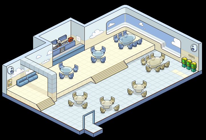 Once known as the Iced Bar, the Ice Cafe was a Public Room home to a cool, blue room complete with Room-O-Matics in the upper right hand corner. Many Habbos link this room to Iced range of furni, due to the similar pastel colours, although no actual items exist in this room.