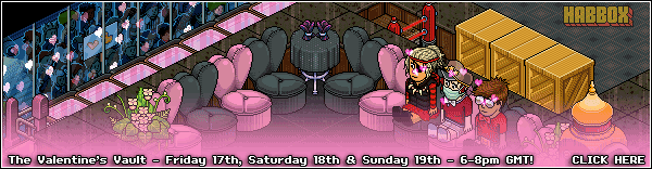 The Valentine's Vault was a HabboxLive event which was run during Valentine's 2012 at Habbox. The event ran for three nights (17th, 18th and 19th) and was organised by DJ Woodseh, DJ Logan and DJ Rain. It was confirmed on the 10th March 2012 during a pre-Vault giveaway that The Vault would be returning on Saturday the 7th April as a monthly show. The vault no longer runs due to two of the original DJs no longer being in the HabboxLive Department.